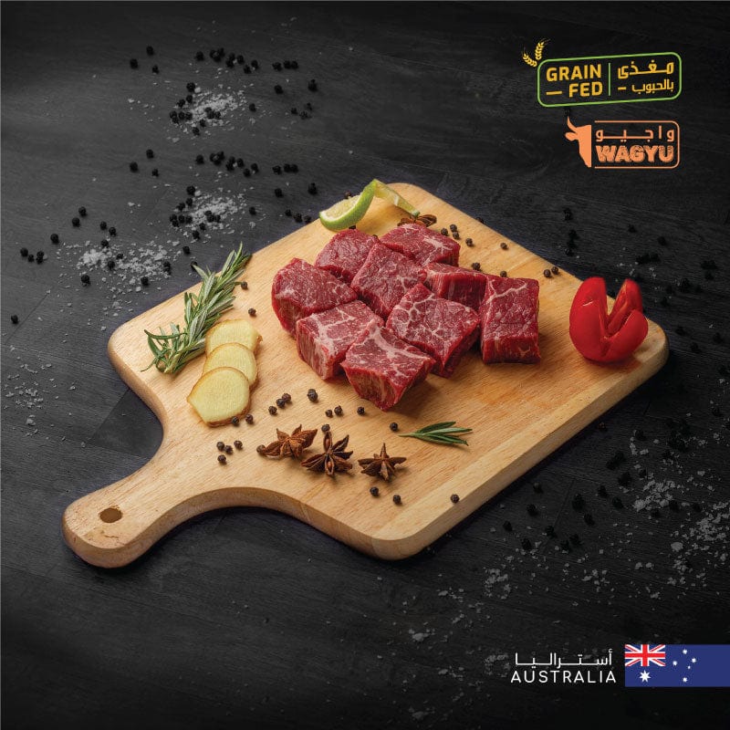 250 جم، 500 جم، أو عبوة 1 كجم من مكعبات لحم واغيو الأسترالي الطازج المُغذى على الحبوب لتجربة غنية بالنكهات. خالية 100% من الهرمونات والمضادات الحيوية. جميع منتجاتنا 100% حلال.