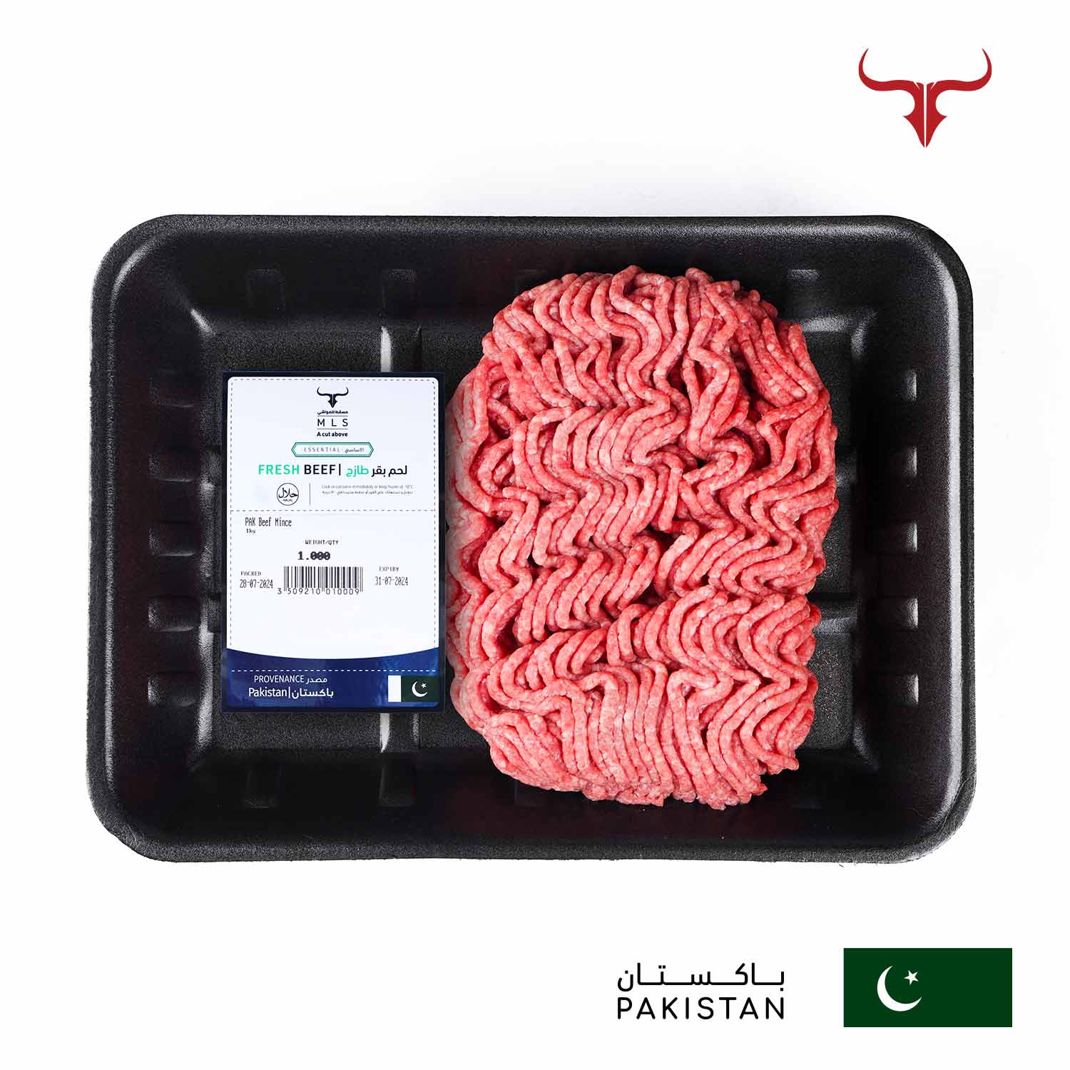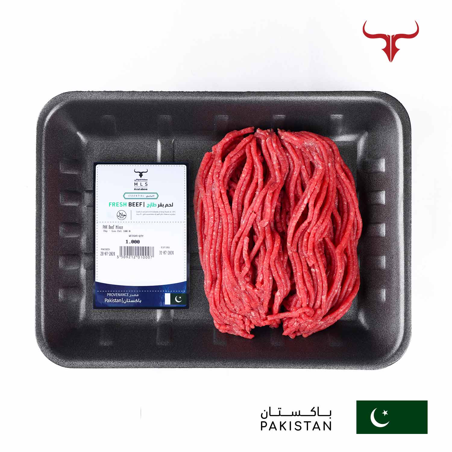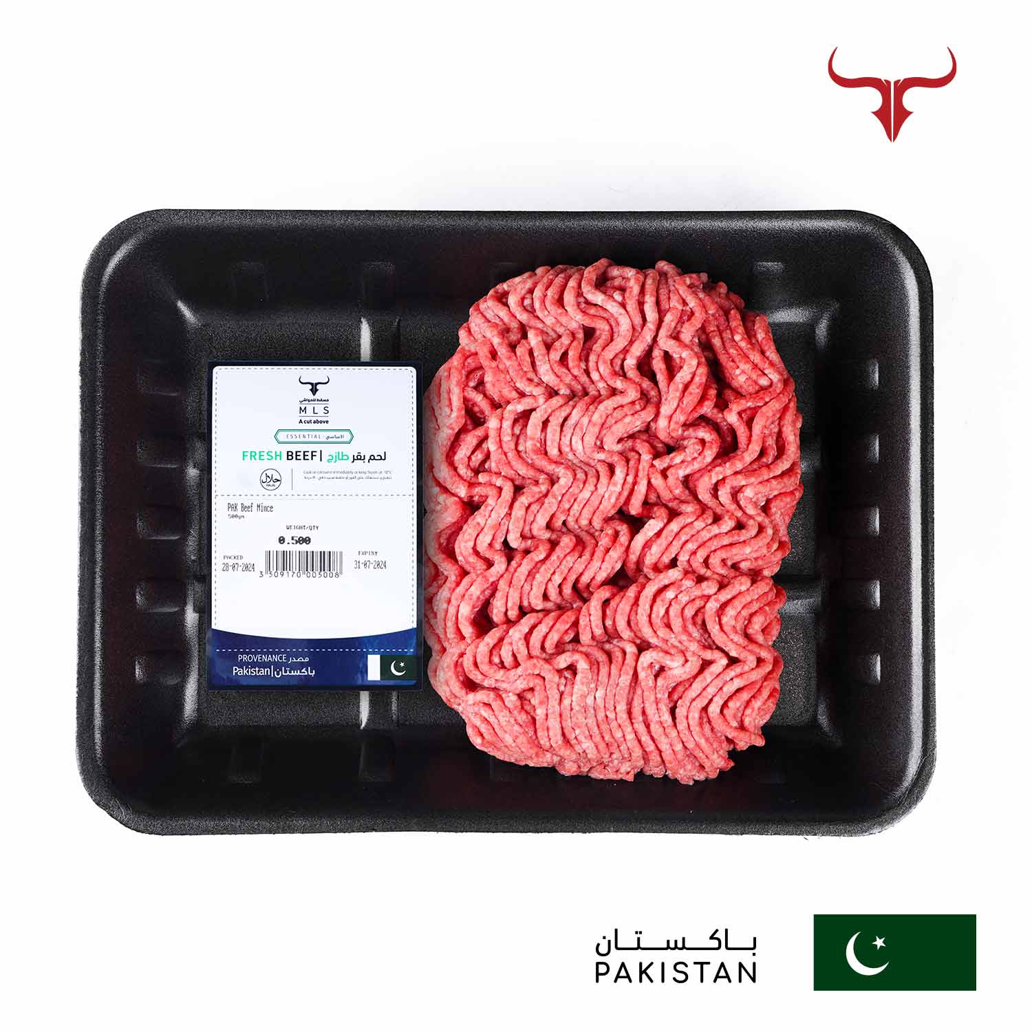 250 جم، 500 جم، أو 1 كجم عبوة من لحم البقر الباكستاني الطازج المفروم، مذبوح حديثًا ومشحون جواً إلى مسقط. جميع منتجاتنا 100% حلال.