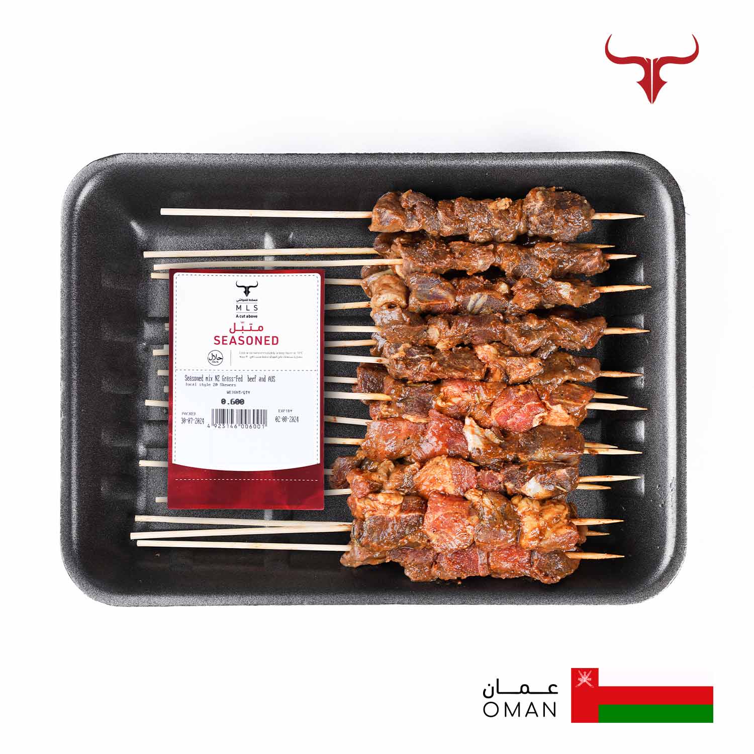 خلط مشكك متبل محضر على الطريقة المحلية من لحم بقر نيوزيلندي طازج ولحم ضأن أسترالي طازج مع قطعة دهن في الوسط. 40 جم لكل سيخ لحم ضأن و30 جم لكل سيخ لحم بقر. 50% أسياخ لحم بقر و50% أسياخ لحم ضأن في طلبك المختلط. 100% طازج. 100% حلال.