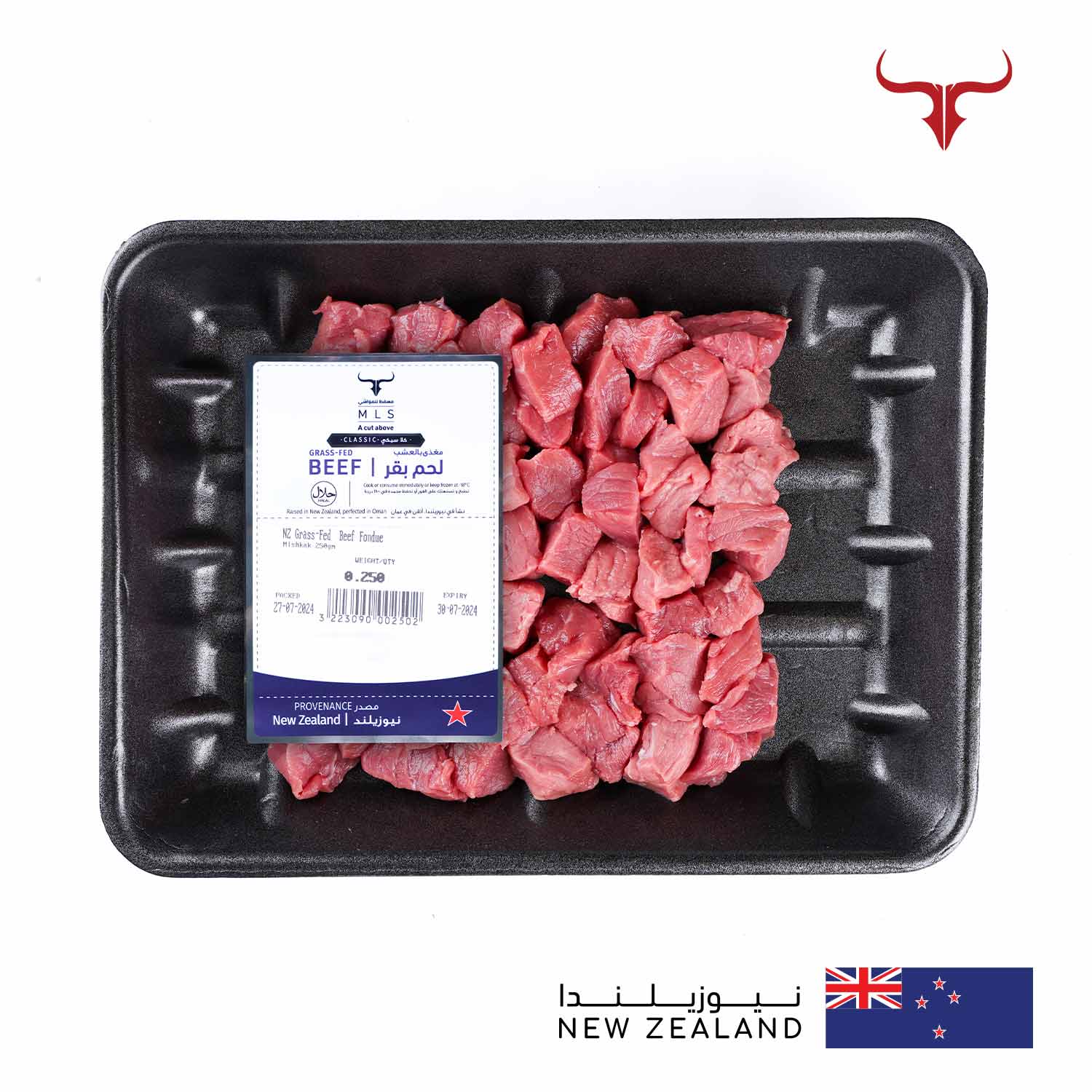 250gm or 500gm or 1 kg packet of fresh beef fondue made from topside or knuckle of grass-finished New Zealand grass fed beef.